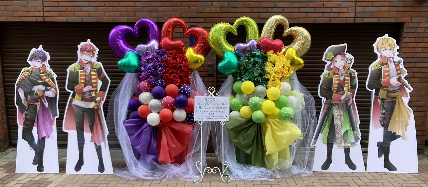 USSSソロフェスのフラスタ。紫・赤・緑・黄のカラフルなバルーンと造花で、華やかでポップな雰囲気を演出。推しキャラパネルも目を引きます。