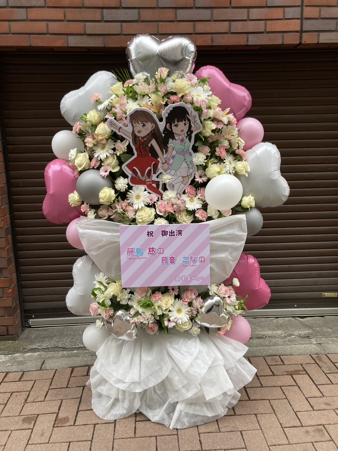 LoveLive! ユニット甲子園へのお祝いフラスタ。ピンクと白を基調とした華やかな色合いで、キャラクターパネルとバルーンが可愛らしい雰囲気を演出しています。