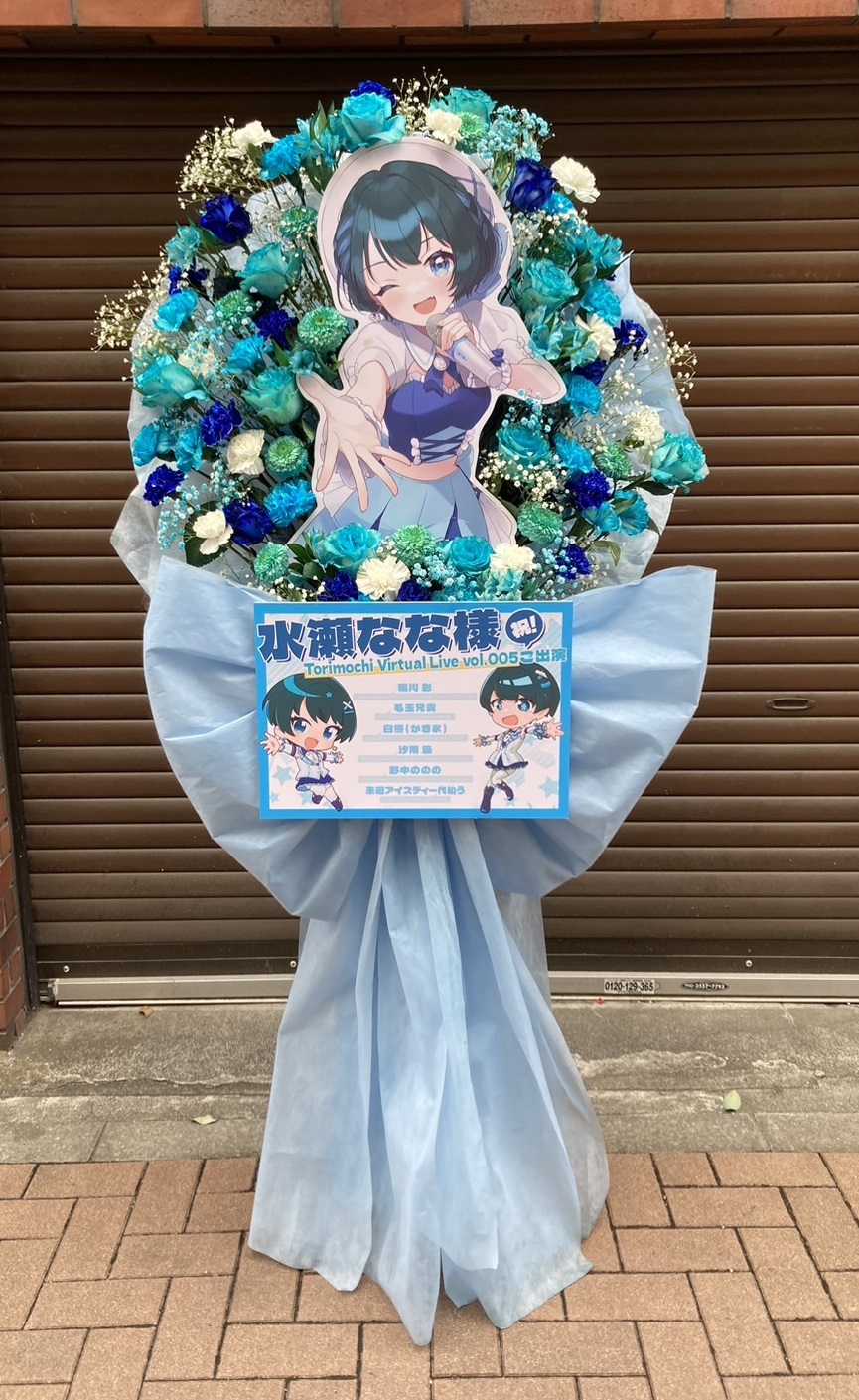 水瀬なな様のTorimochi Virtual Live出演を祝うフラスタ。青と白の生花で爽やかさと華やかさを演出。メインパネルが魅力的。