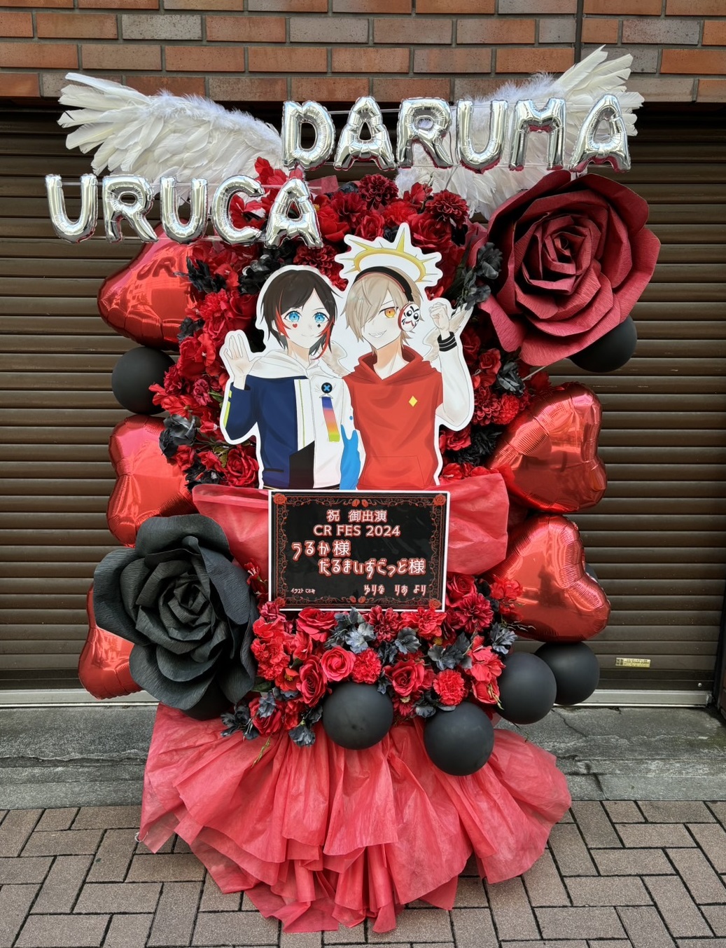 赤と黒を基調とし、クールで情熱的な雰囲気を演出。羽やキャラクターパネル、バルーンで豪華に飾られたフラスタ。