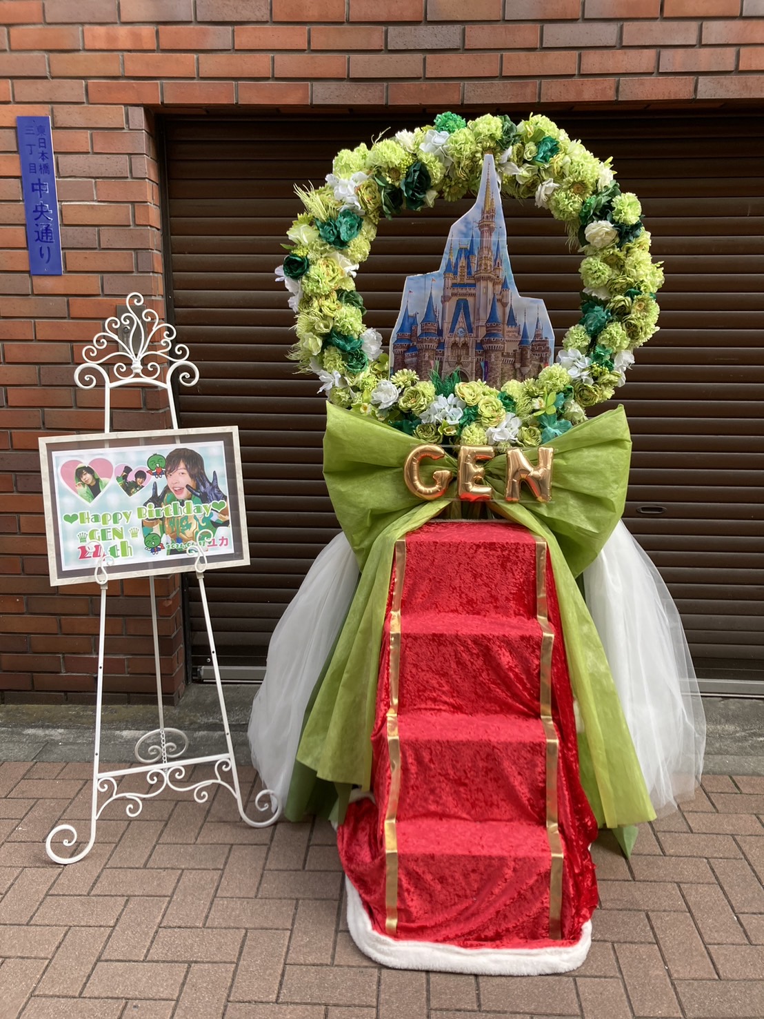 緑と赤を基調に、シンデレラ城のようなパネルが目を引くフラスタ。GENさんのお誕生日をファンタジックにお祝いする、華やかで夢あふれるデザインです。