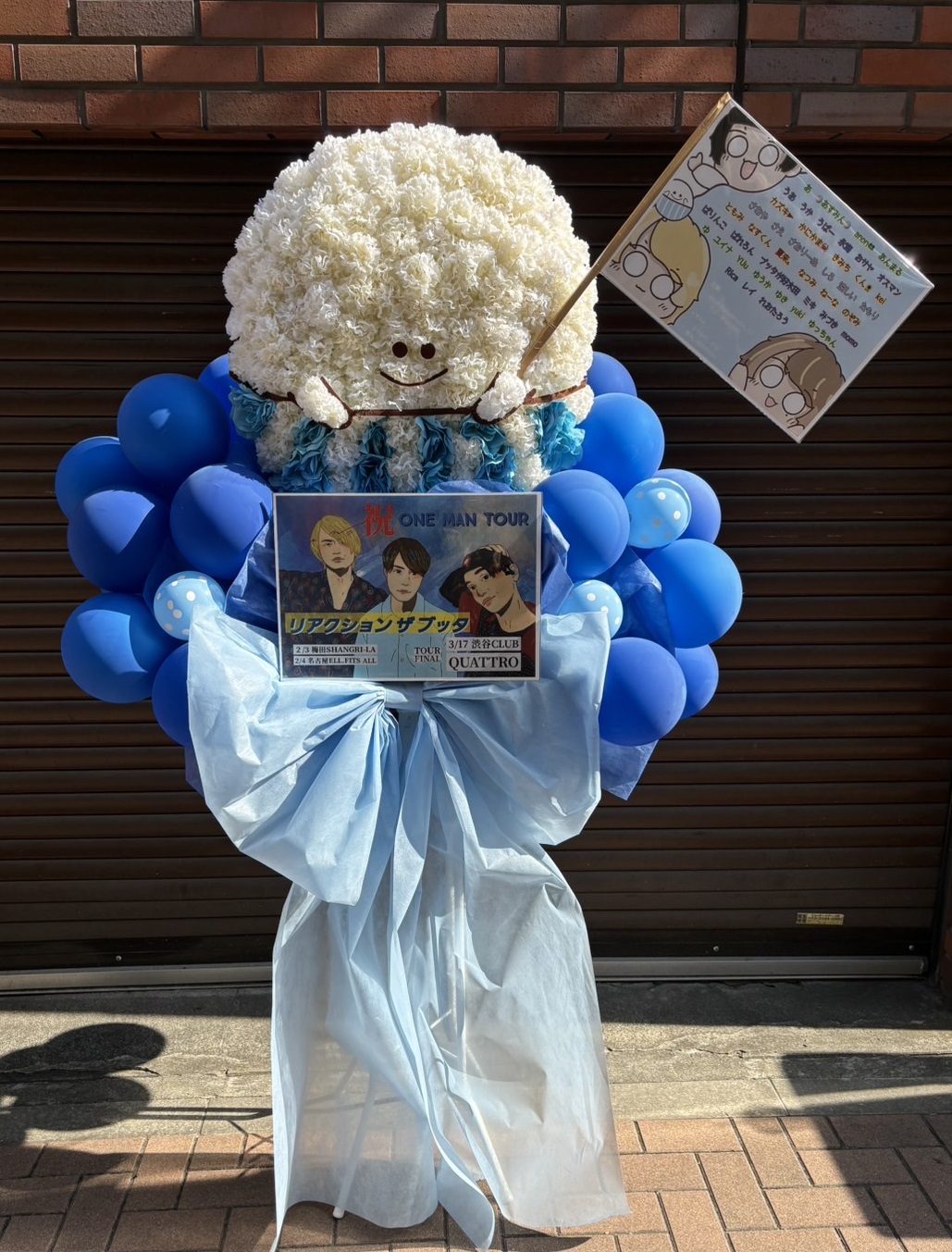 青と白の爽やかな色合いが魅力のフラスタ。キュートなキャラクターとバルーンで、楽しいワンマンツアーを祝福します。