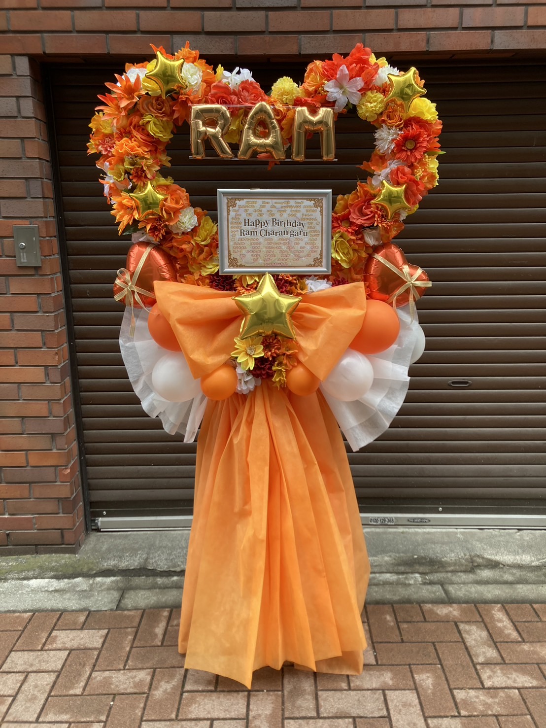 Ram Charan氏の誕生日を祝う、温かみのあるフラワースタンド。オレンジと黄色を基調に、ハート型のお花とバルーンが華やかさを添えています。