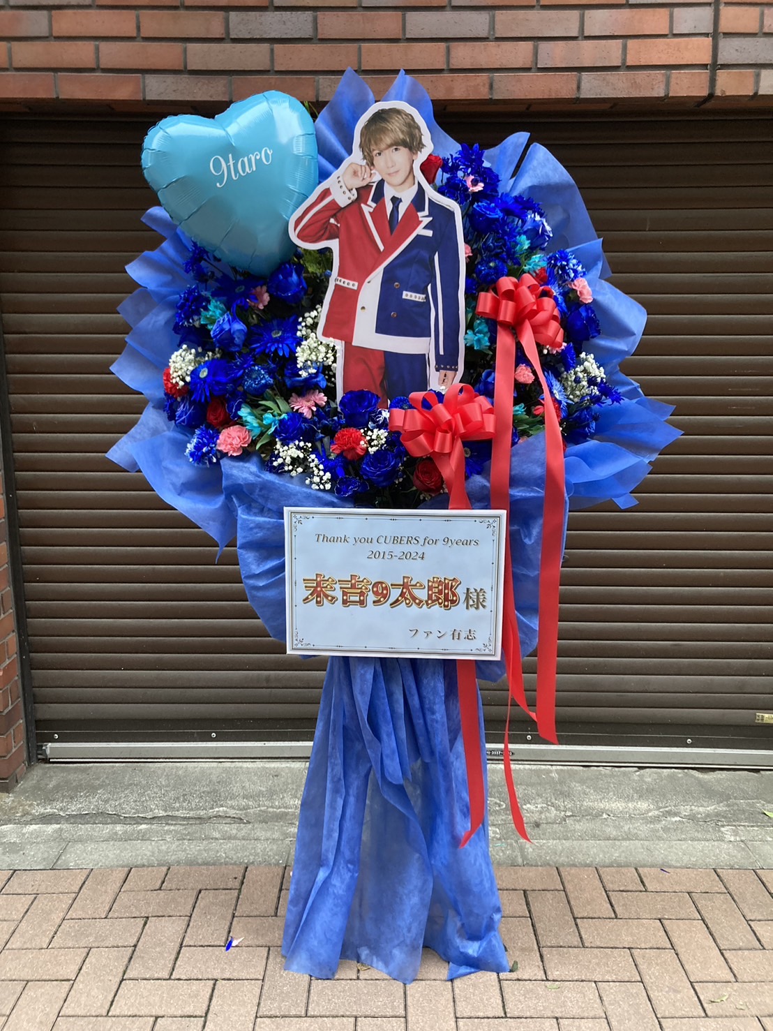 CUBERSラストライブへ。鮮やかな青と赤が織りなす情熱的なフラスタ。推しへの深い感謝が伝わるデザインです。