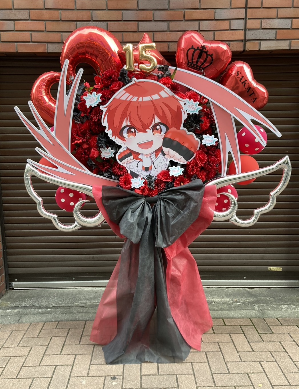 赤と黒を基調とした情熱的なフラスタ。キャラクターパネルを中心に、豪華な生花とバルーンでAHO NO SAKATAさんの15周年ツアーをお祝い。華やかな雰囲気が目を引きます。