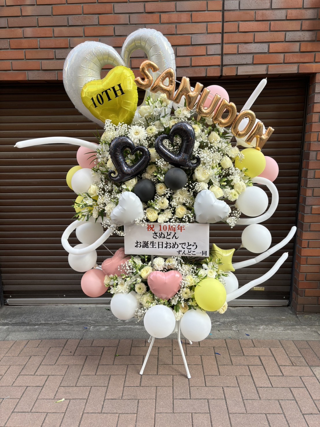 白とパステルカラーを基調に、たくさんのバルーンで飾られた華やかなフラスタ。ハート型のバルーンが可愛らしく、お祝いムード満点です。