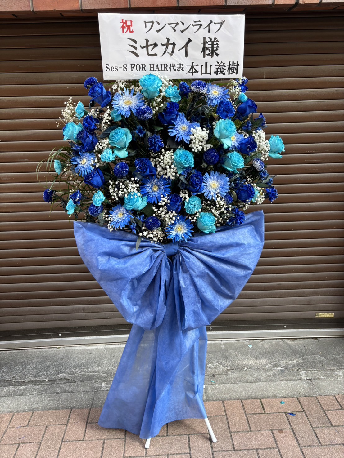 ミセカイ様のワンマンライブを祝うフラスタ。青と水色の鮮やかな花々が、白い小花と共に爽やかで華やかな雰囲気を演出しています。