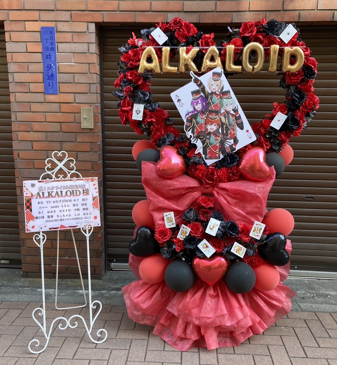 「ALKALOID」をイメージした赤と黒がメインのハート型フラスタ。ゴールドの文字とトランプモチーフがゴージャスで大人な雰囲気を演出しています。