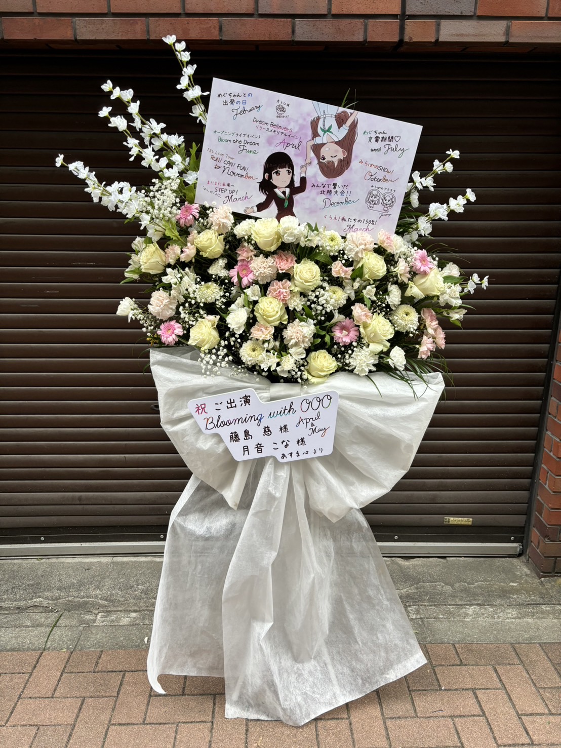 白とパステルカラーの生花が織りなす、優しい雰囲気のフラスタ。キャラクターパネルがイベントを華やかに彩ります。