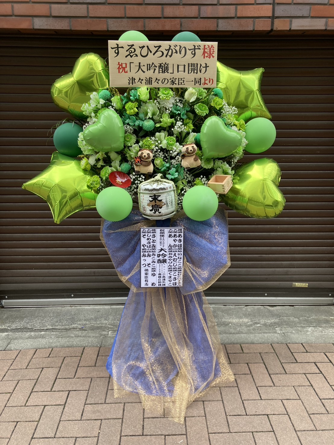 すゑひろがりず全国八都巡り「大吟醸」祝花。緑と青を基調に金が輝く、和風で豪華なフラスタ。祝樽がアクセント!