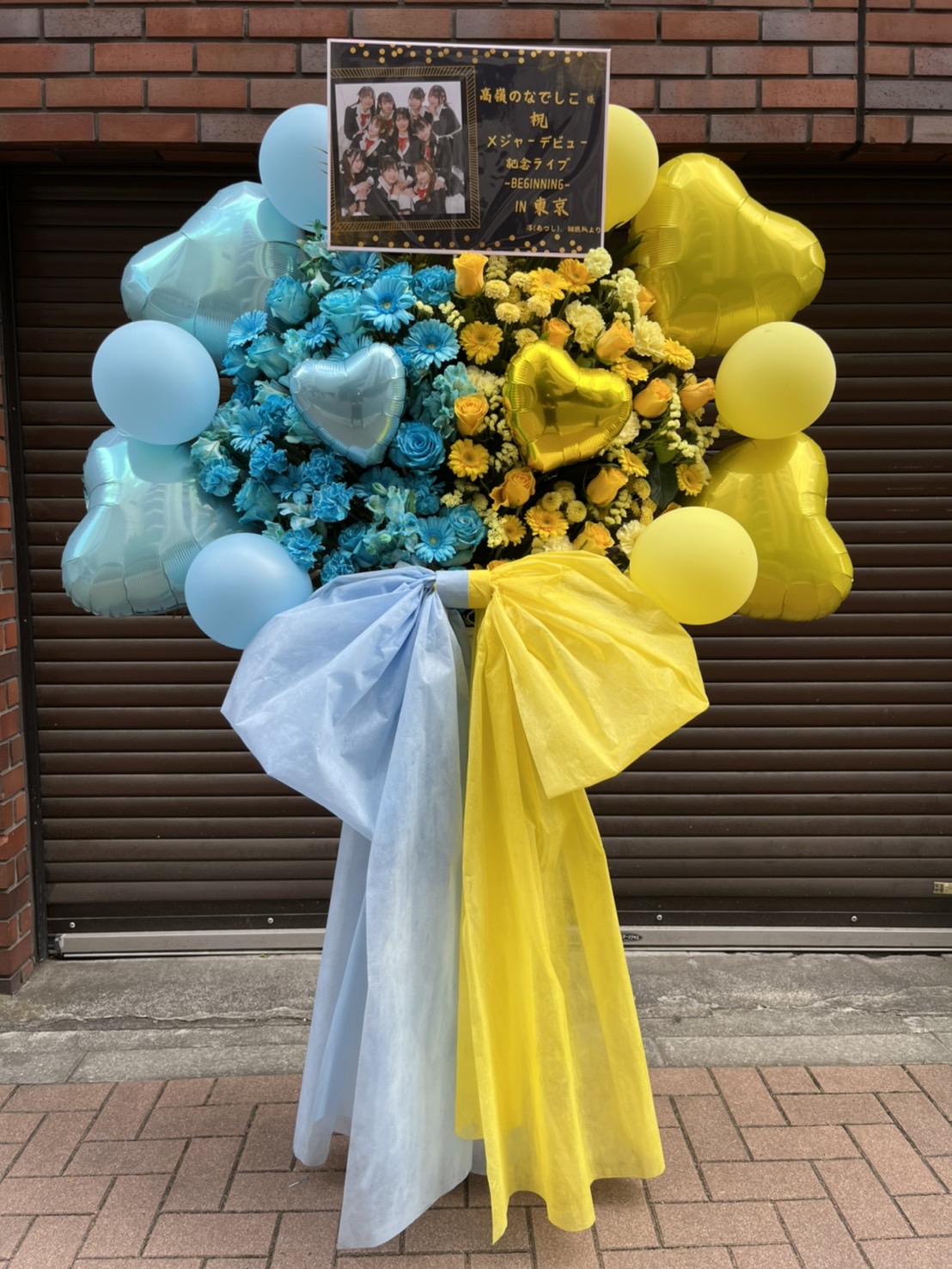 高嶺のなでしこメジャーデビュー記念ライブを祝う、青と黄色のフラスタ。バルーンと生花が織りなす華やかな空間が、会場を彩ります。