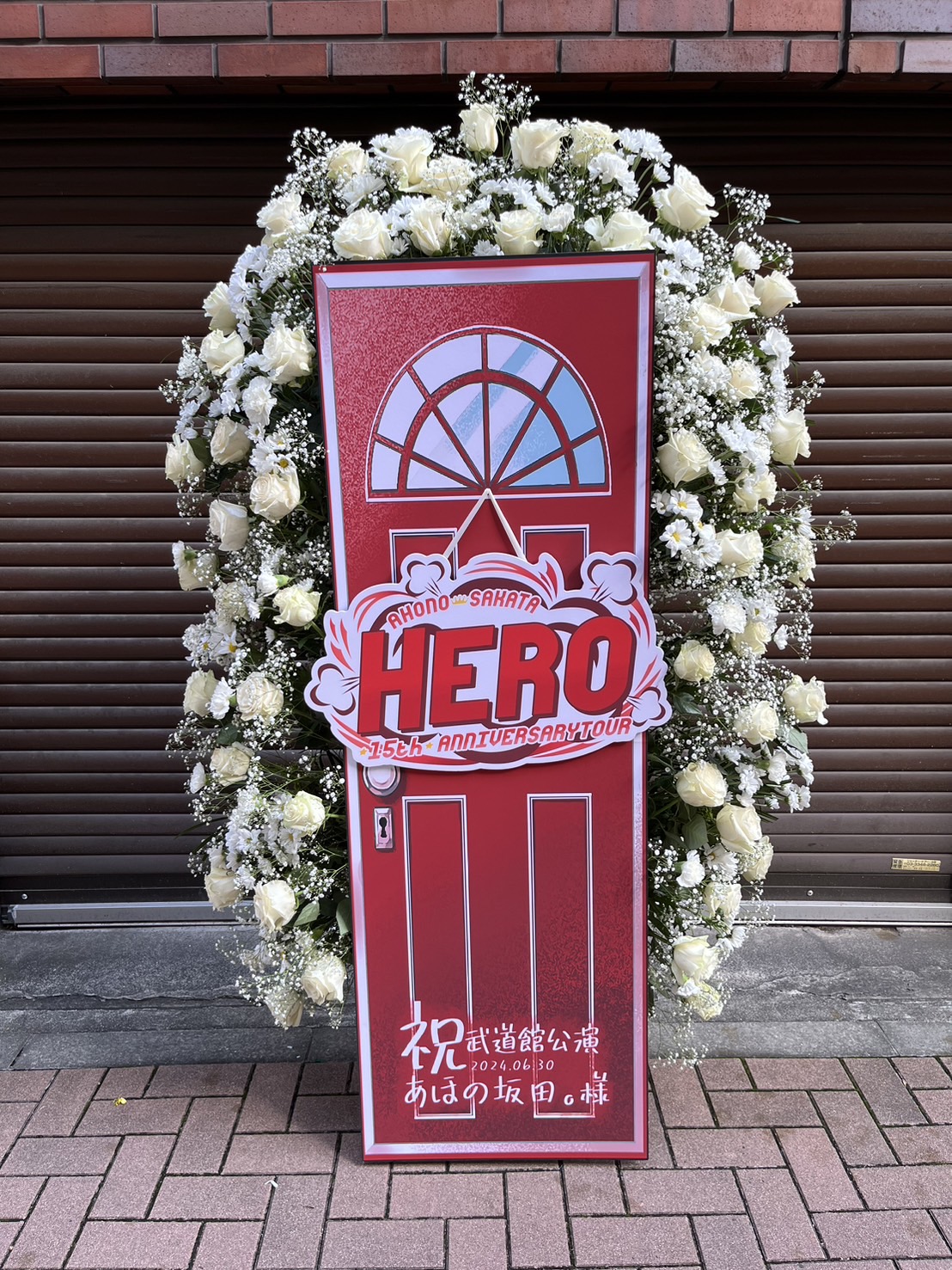 白を基調とした豪華な生花に、赤と青の扉型パネルが映えるフラスタ。15周年ツアーの門出を祝う、華やかで力強いデザインです。