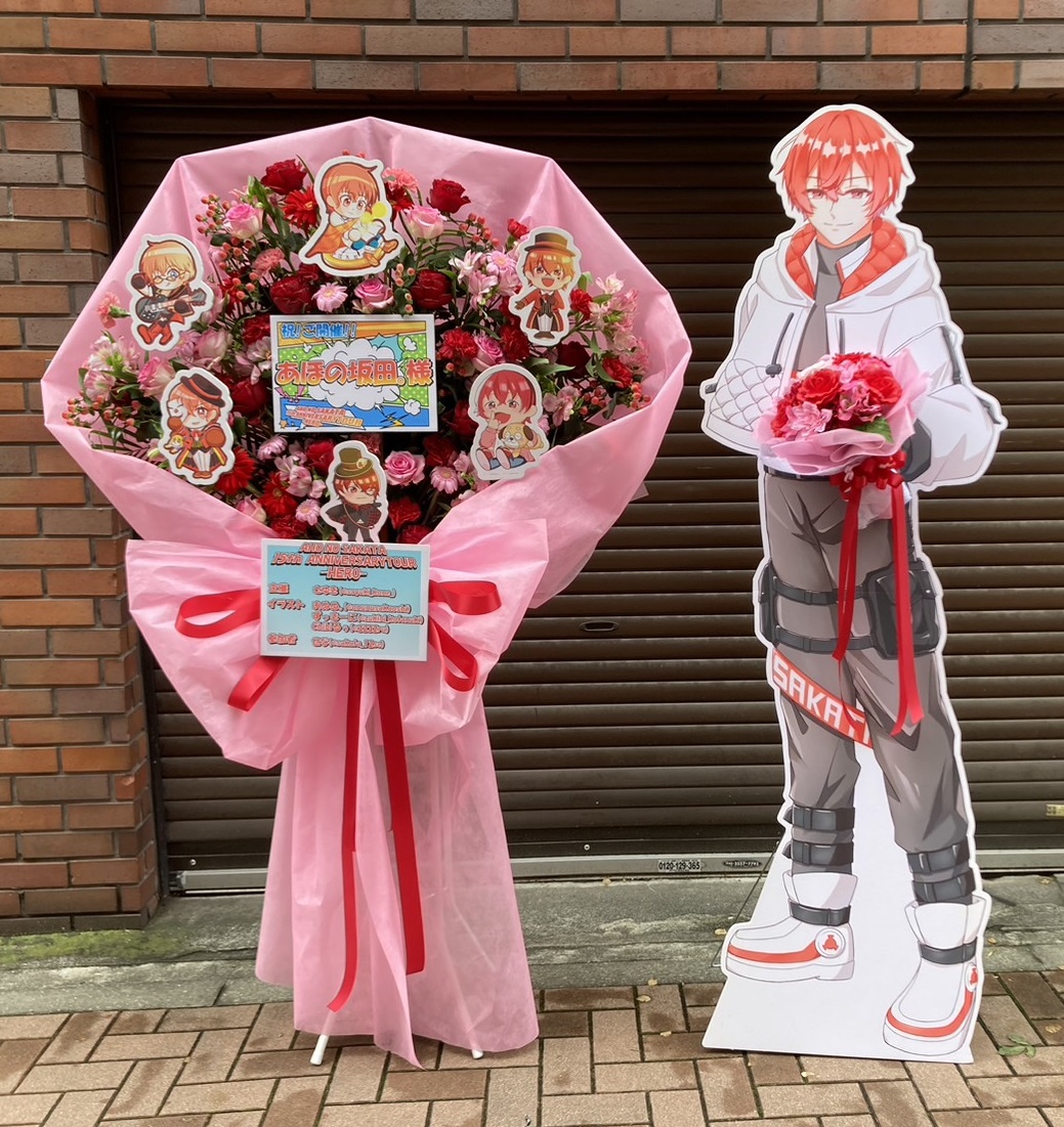 あほの坂田。さんの15周年ツアーを祝うフラスタ。赤とピンクの生花とミニキャラ、等身大パネルで、華やかでキュートな雰囲気を演出しています。
