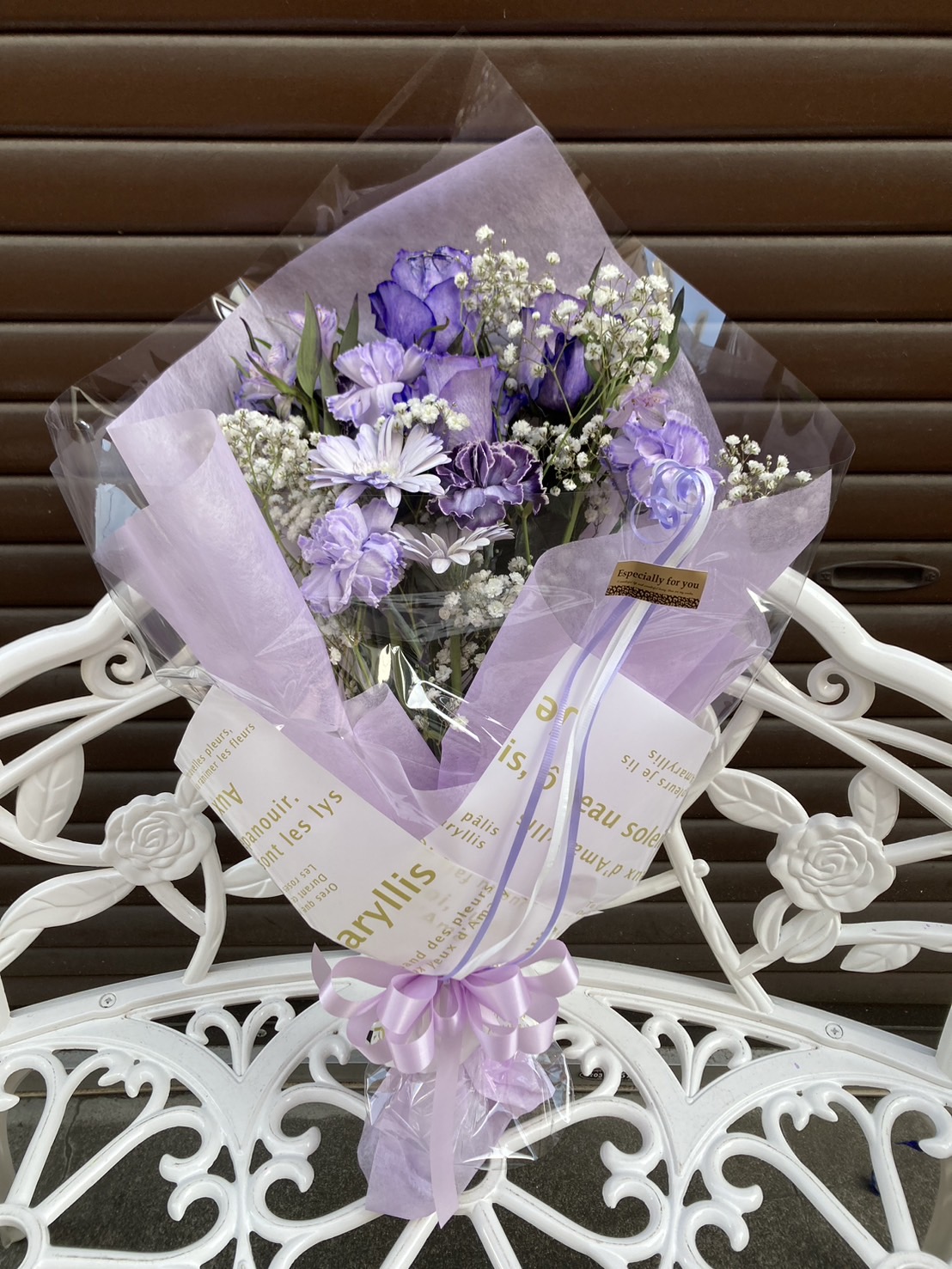 上品な紫色と白い花でまとめた、清楚で可憐な花束。イベントの雰囲気に合わせて華やかさを添えます。
