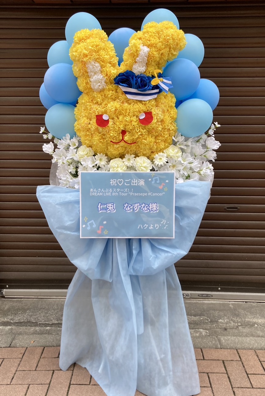 黄色いうさぎが愛らしいフラスタ。パステルブルーのバルーンと白花で、爽やかでキュートな世界観を表現。