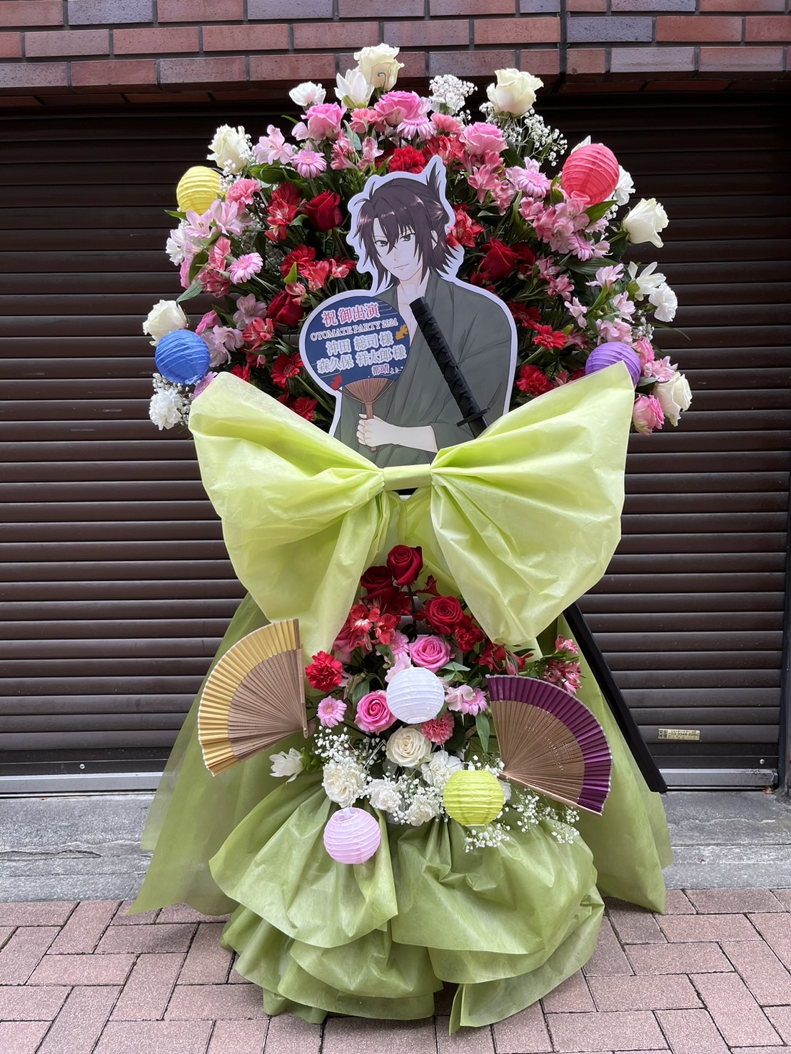 赤・ピンクの華やかな生花と鮮やかな緑の布が彩るフラスタ。和風の提灯や扇子がキャラクターパネルを引き立て、ゴージャスかつ上品な雰囲気です。