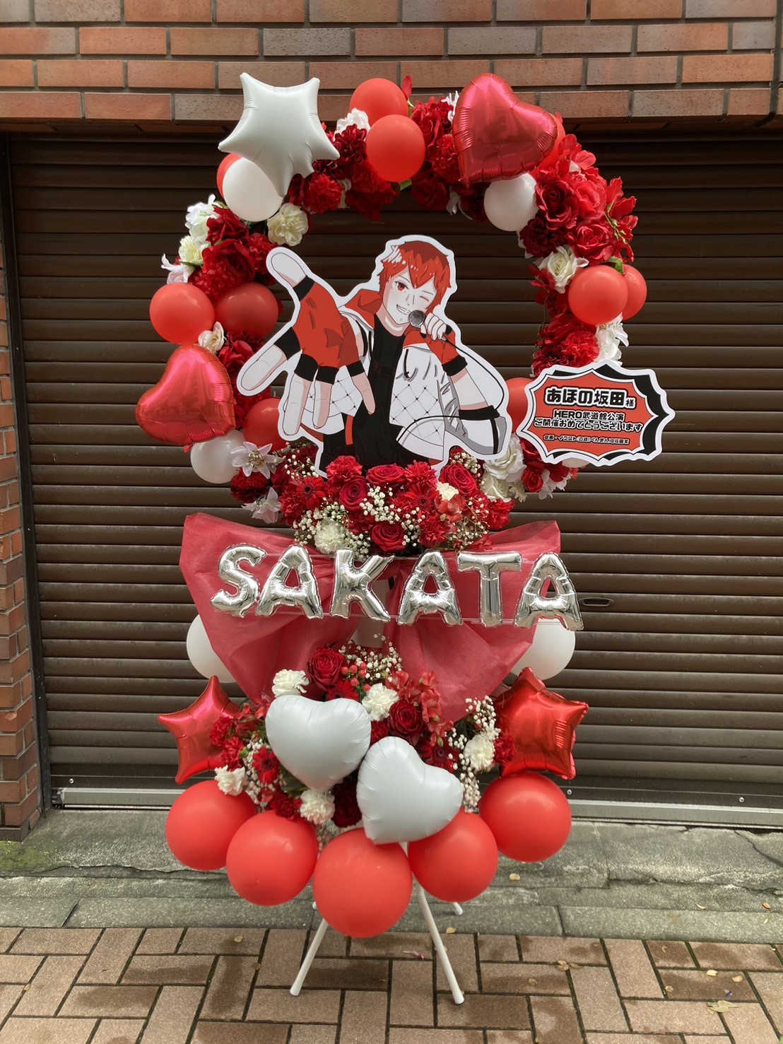 「AHO NO SAKATA 15th ANNIVERSARY TOUR -HERO-」を祝福する、赤と白を基調とした華やかなフラスタ。キャラクターパネルを中心に、バルーンと生花が豪華に彩り、情熱的なお祝いの雰囲気を演出しています。