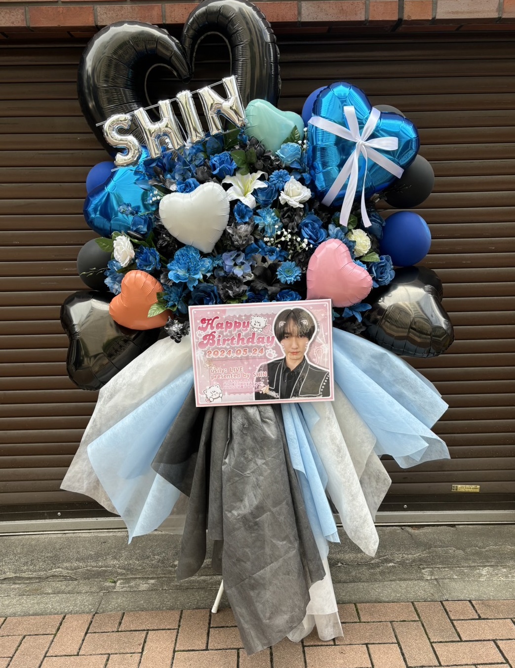クールなブルーとブラックを基調に、白い花やハートのバルーンで華やかさを添えたフラスタ。SHINさんのお誕生日をお祝いする、スタイリッシュなデザインです。