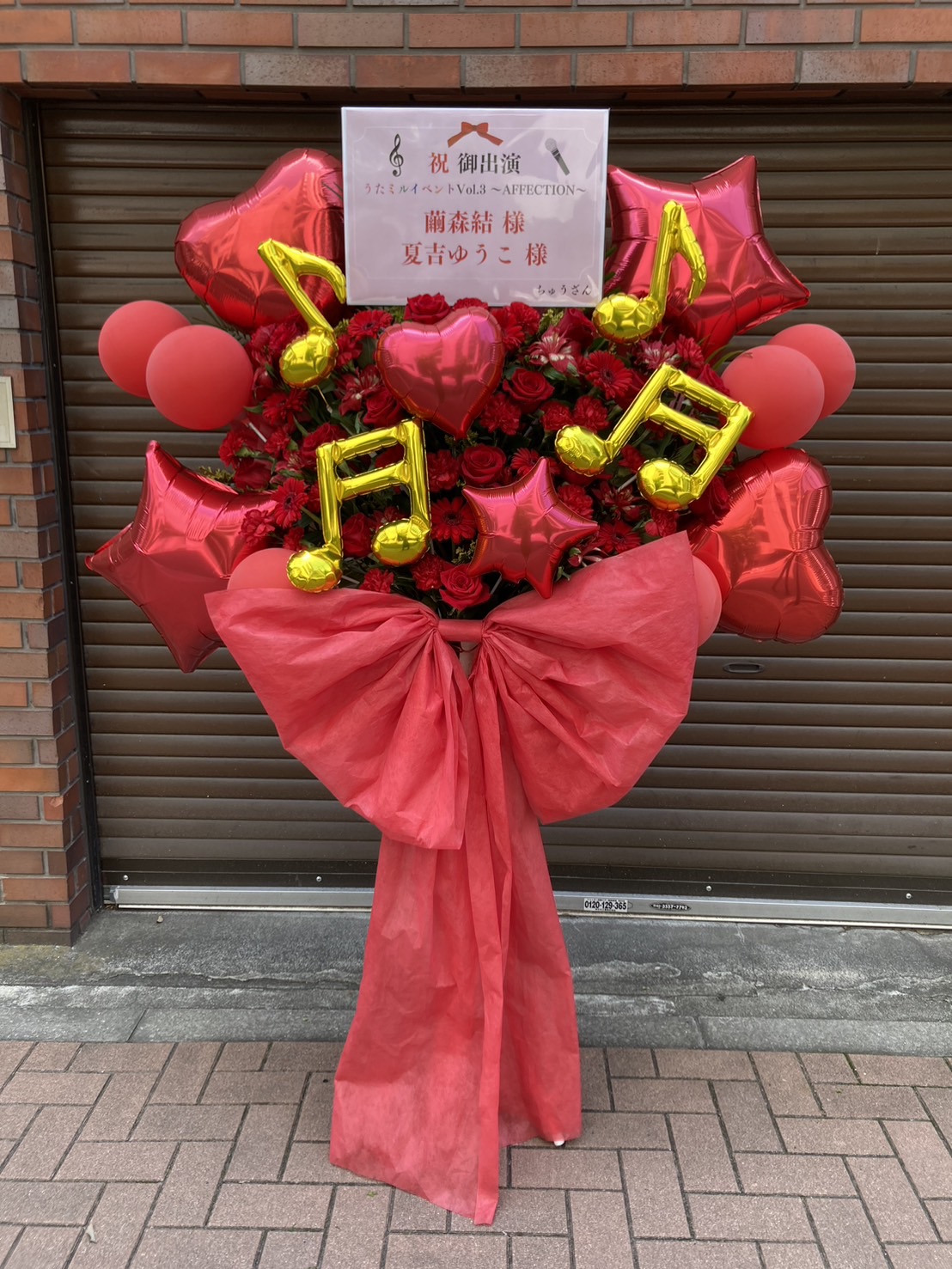 赤を基調とした華やかなフラスタ。金色の音符バルーンとハートが、音楽イベントにぴったりの賑やかな雰囲気を演出しています。