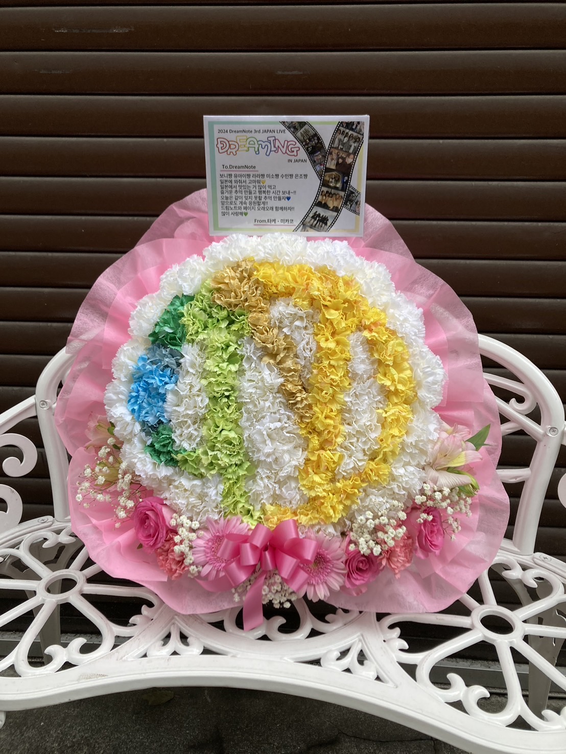 ピンクを基調に、カラフルな生花で「DREAMING」の文字を表現した、明るく華やかなフラワースタンド。