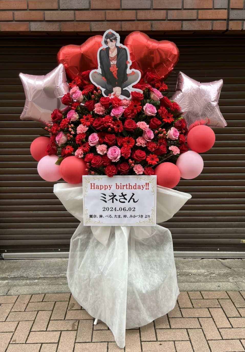 赤とピンクの鮮やかな生花で彩られた、豪華なバースデーフラスタ。キャラクターパネルとバルーンで、お祝いムードを盛り上げています。