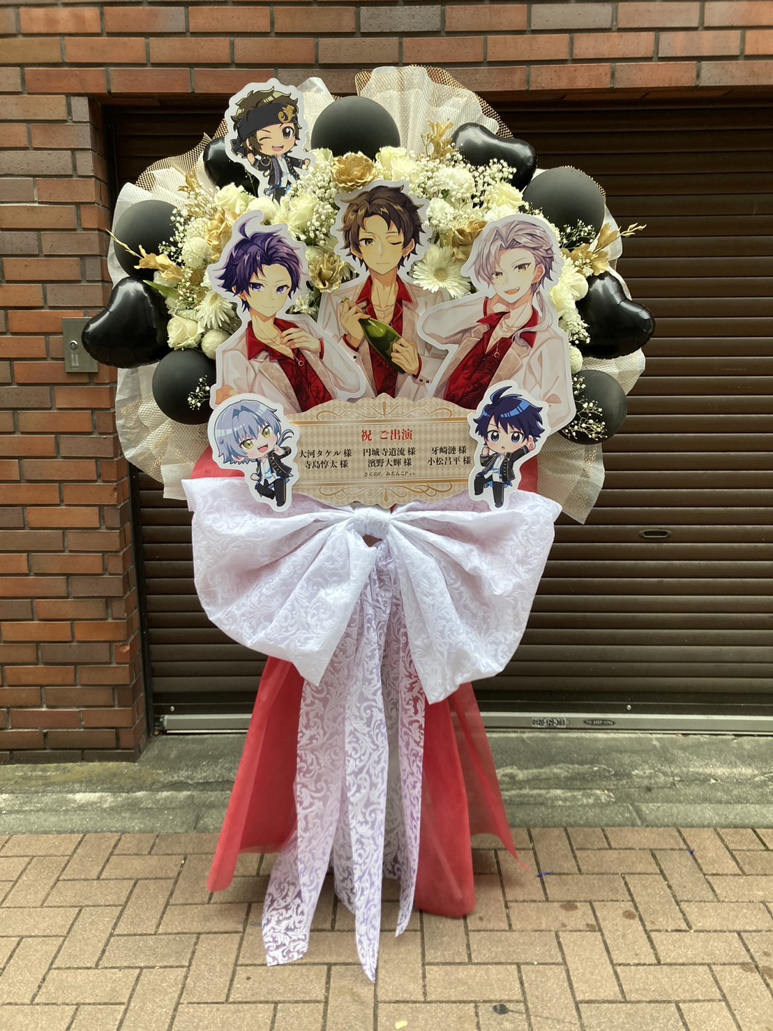 赤、白、黒を基調とし、キャラクターパネルが映えるクールで華やかなフラスタです。