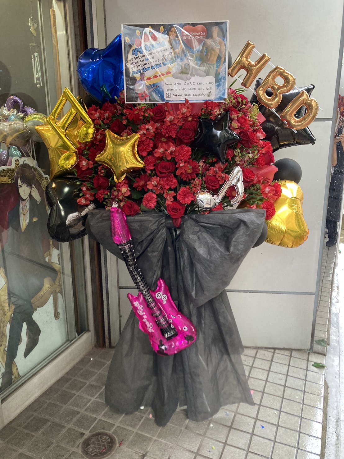 情熱的な赤の生花をメインに、ゴールドのバルーンと黒でロックな雰囲気を演出。ピンクのギターがアクセントの豪華なフラスタです。