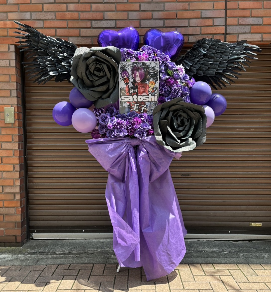 紫と黒を基調に、羽根やバラでクールにまとめられたフラスタ。力強くも華やかなデザインです。