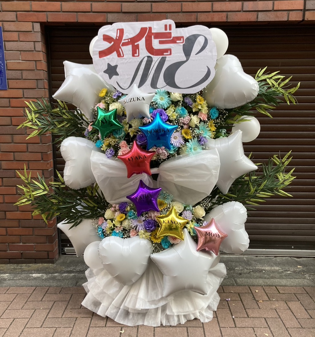 白バルーンとパステルカラーの生花が織りなす華やかなフラスタ。メンバーカラーの星が輝き、キュートで賑やかな雰囲気を演出しています。