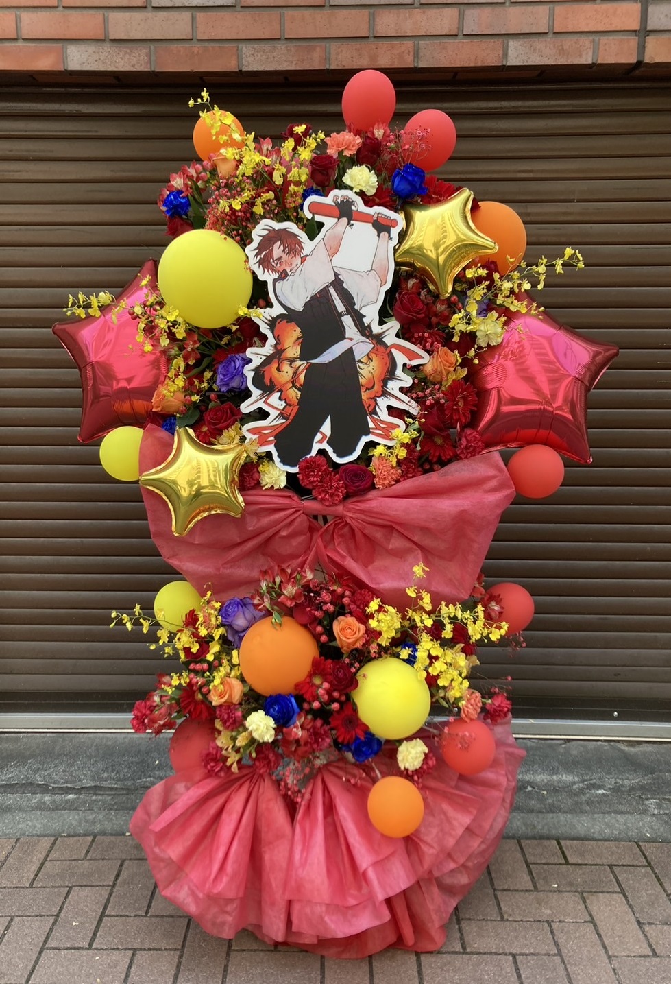 赤、黄、オレンジを基調とした、たくさんの生花とバルーンが華やかなフラスタ。中央のキャラクターパネルがイベントを盛り上げます。