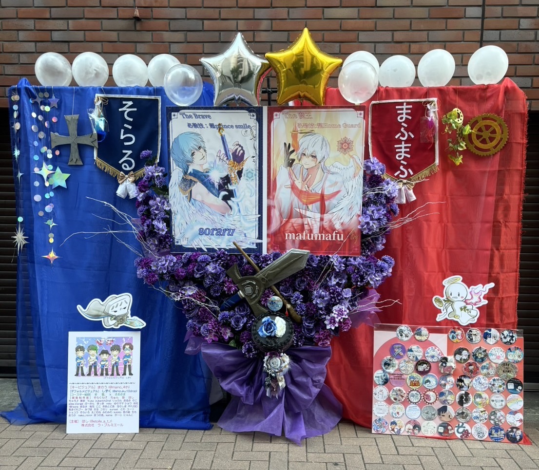 青と赤のツートンカラーが印象的。紫の生花が豪華で、そらるさん&まふまふさんのパネルが華やかに飾られたライブ向けフラスタ。