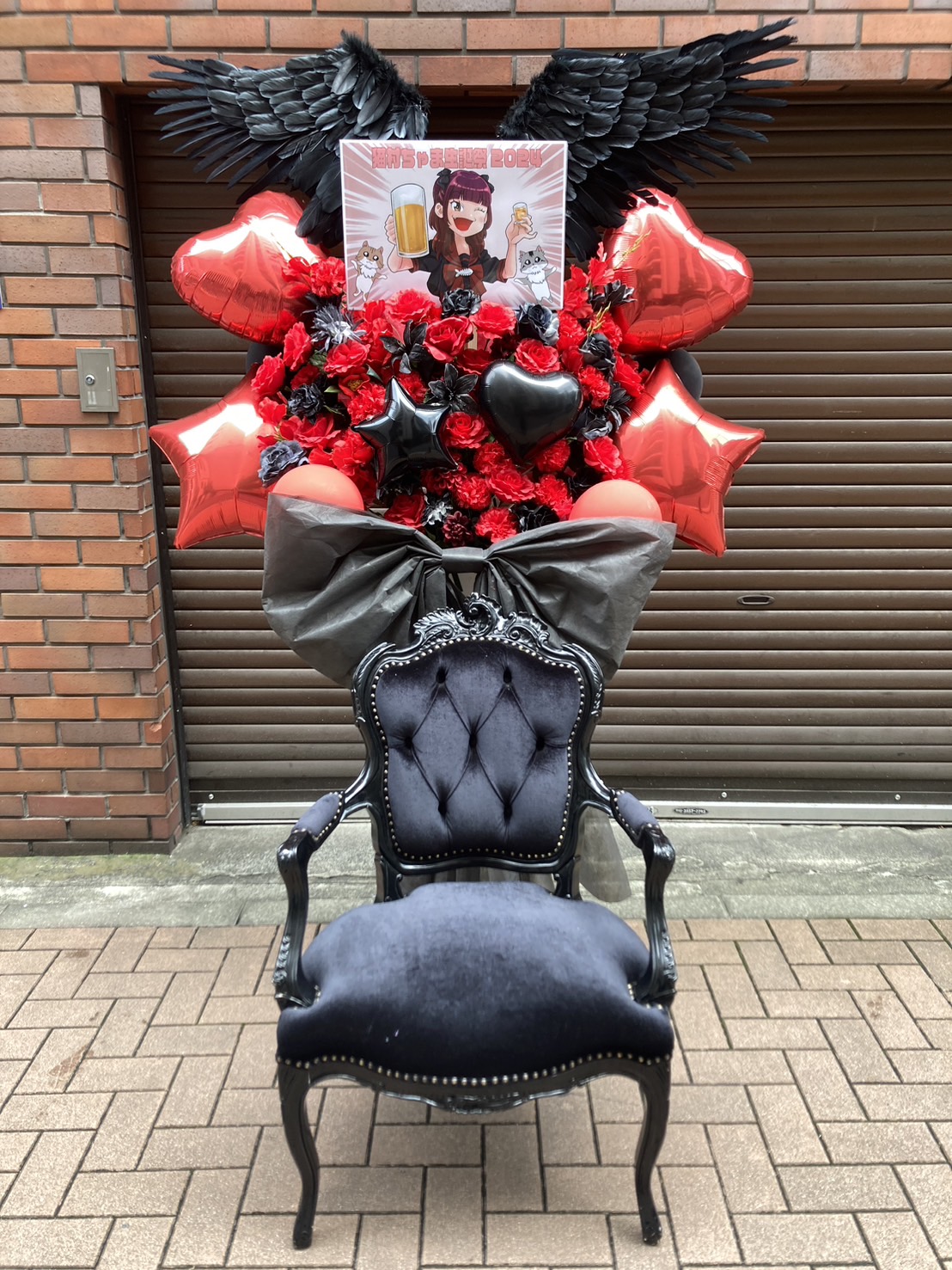 赤と黒を基調とした、ゴージャスでロックな雰囲気の生誕祭フラスタ。大量のバラと羽根、バルーンが目を引く、猫村ちゃまに贈る華やかなデザインです。