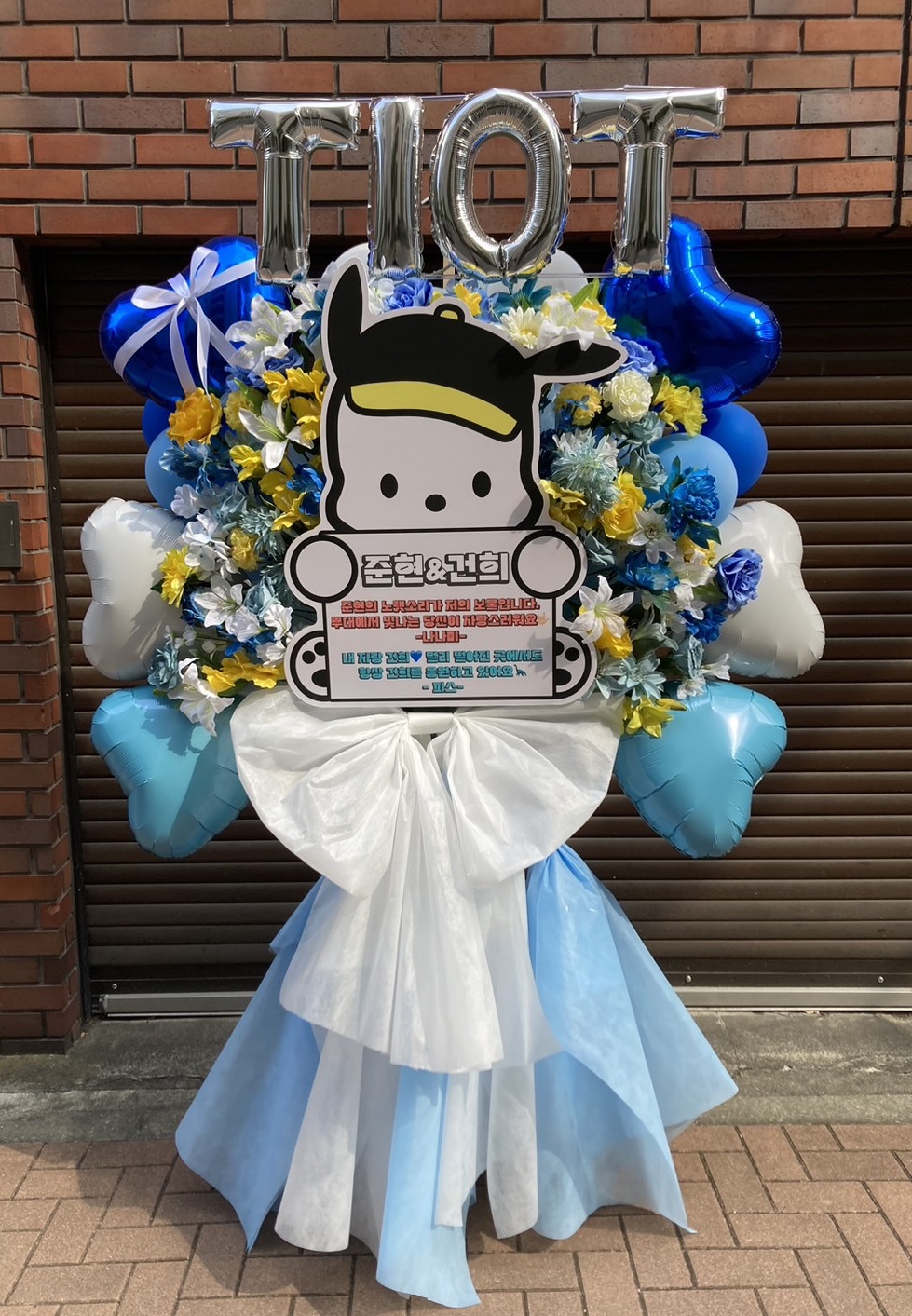鮮やかな青、黄、白で彩られたフラスタ。キャラクターパネルとバルーンがK-POPイベントを華やかに演出します。