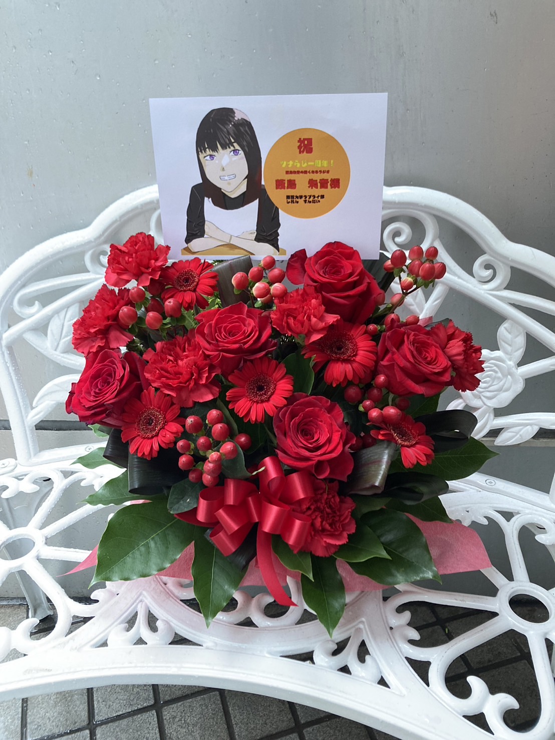 薮島朱音の強くなるラジオ1周年を祝う、情熱的な赤の生花アレンジメント。キャラクターパネルがアクセントとなり、華やかな雰囲気を演出。