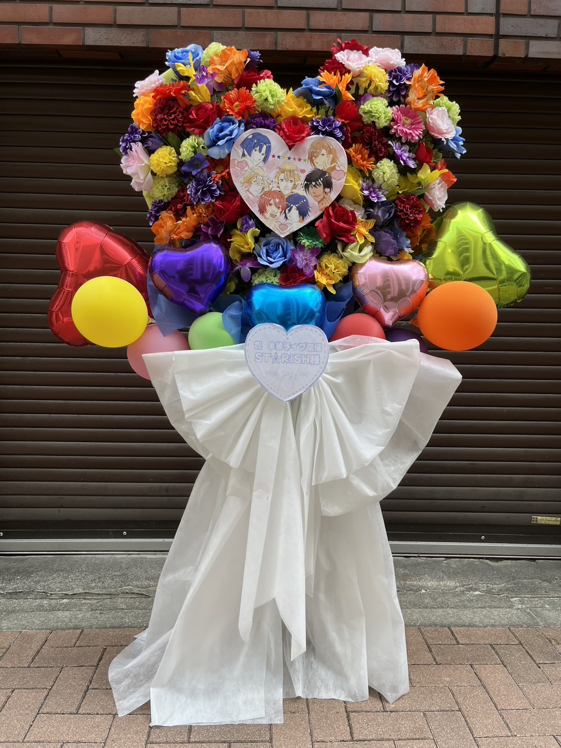 ST☆RISHをイメージした、虹色の花とバルーンが華やかなハート型フラスタ。メンバーカラーを取り入れた明るく楽しい雰囲気が魅力。