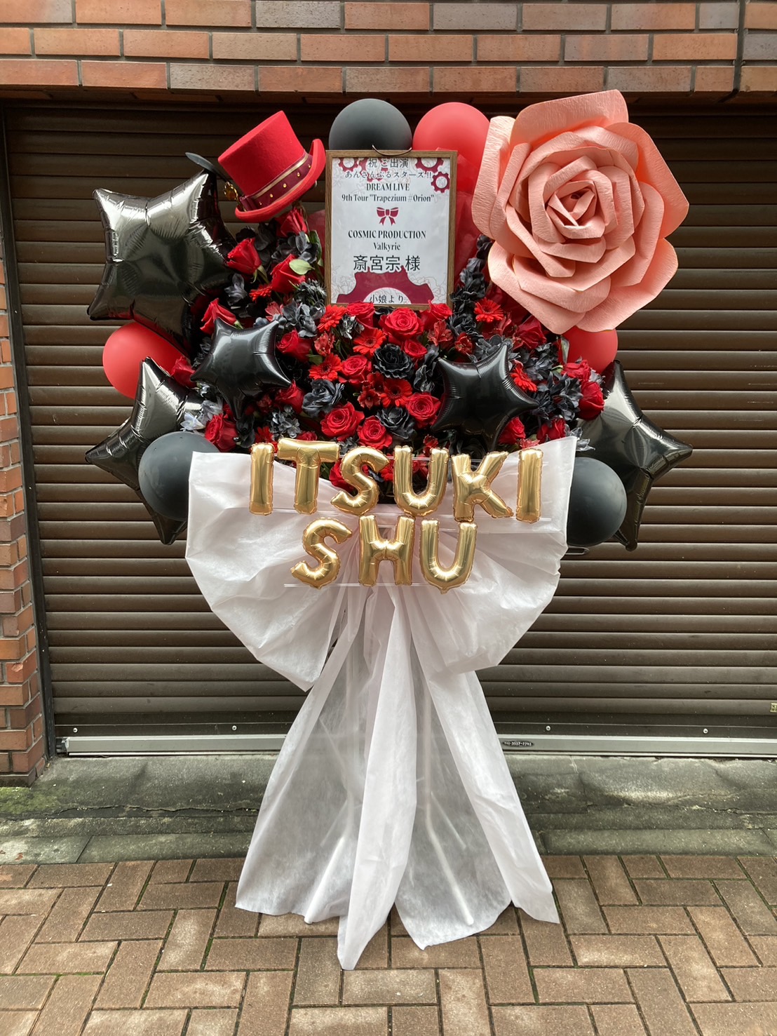 赤と黒のコントラストが情熱的なフラスタ。金色のバルーンや豪華なバラ、トップハットで斎宮宗様のステージを華やかに演出。