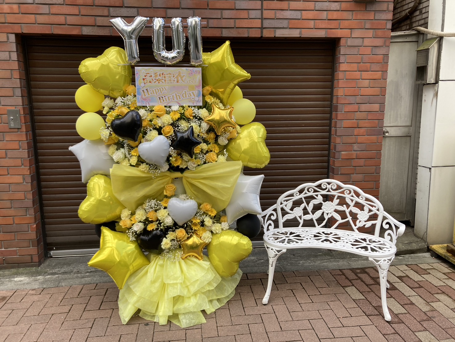黄色をメインに白と黒で引き締めた、高梨由衣さん生誕祭のフラスタ。バルーンと生花で華やかに、お祝いムード満点です。
