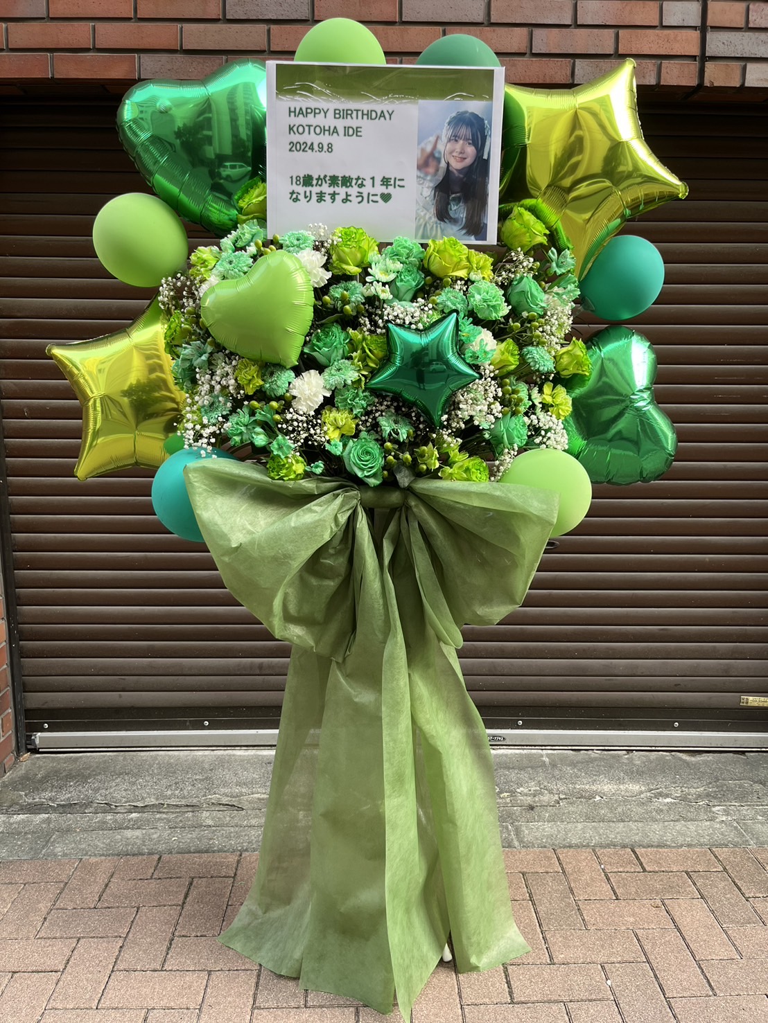 緑を基調とした、爽やかで祝福感あふれるフラワースタンド。バルーンと生花が華やかさを添え、井手詩葉さんの18歳のお誕生日を彩ります。