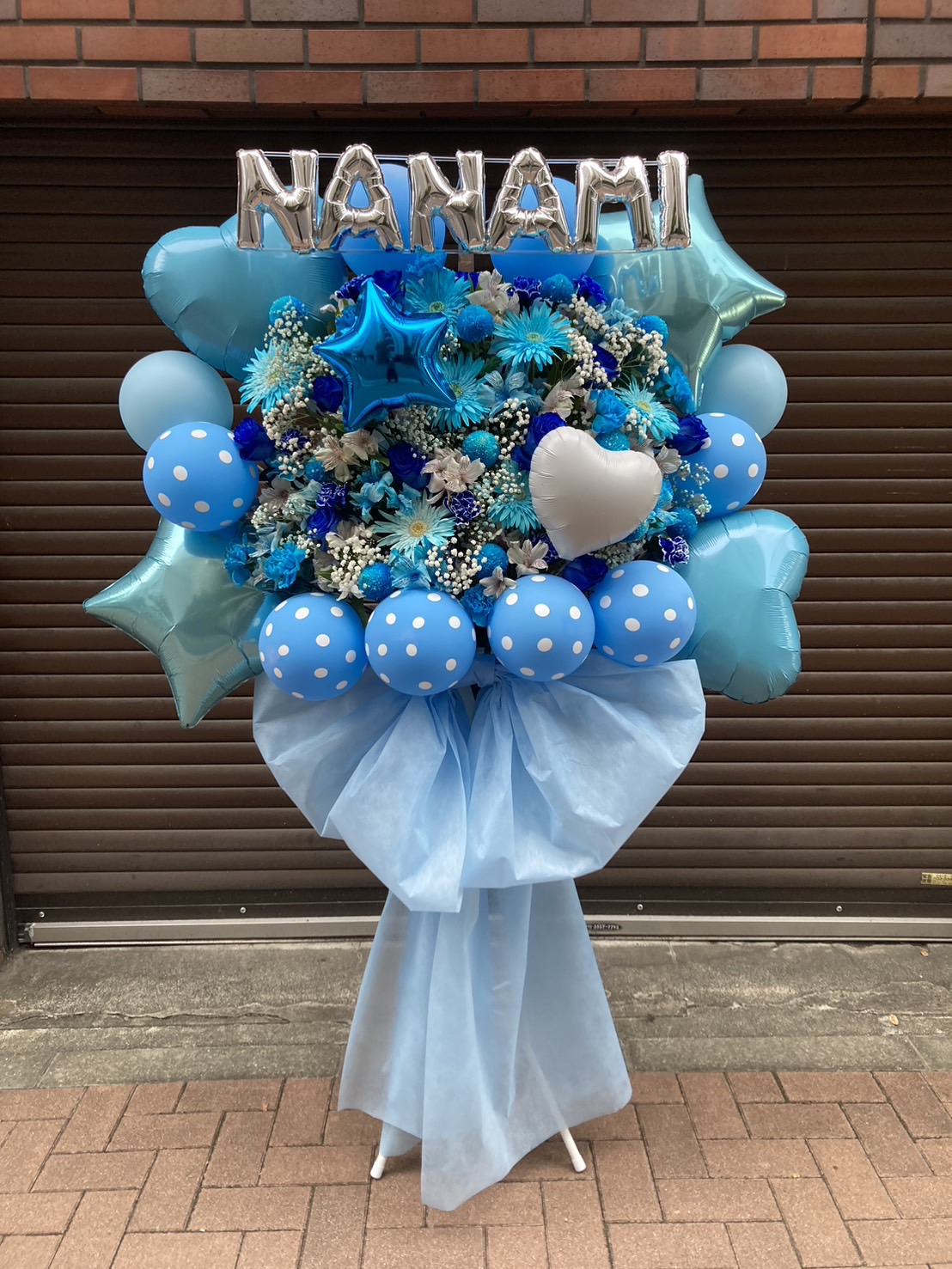 谷崎ななみ生誕祭を彩る、爽やかな水色と白のフラスタ。生花とバルーンで可愛く華やかな雰囲気を表現しました。