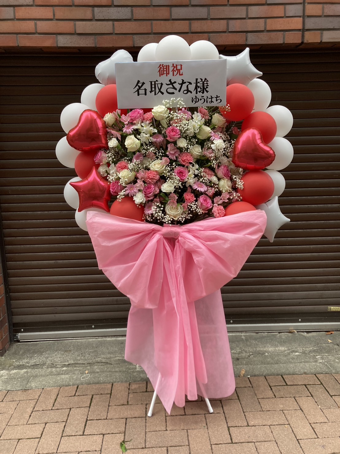 名取さな1stライブを彩る、ピンクと白、赤が基調の華やかなフラワースタンド。可愛らしいバルーンと生花が一体となり、お祝いムード満点です。