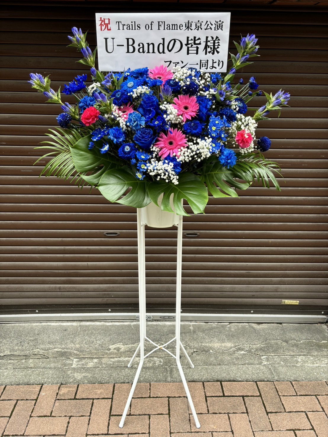 鮮やかな青と情熱的なピンクの花々が目を引くフラスタ。U-Bandの皆様を華やかに彩ります。