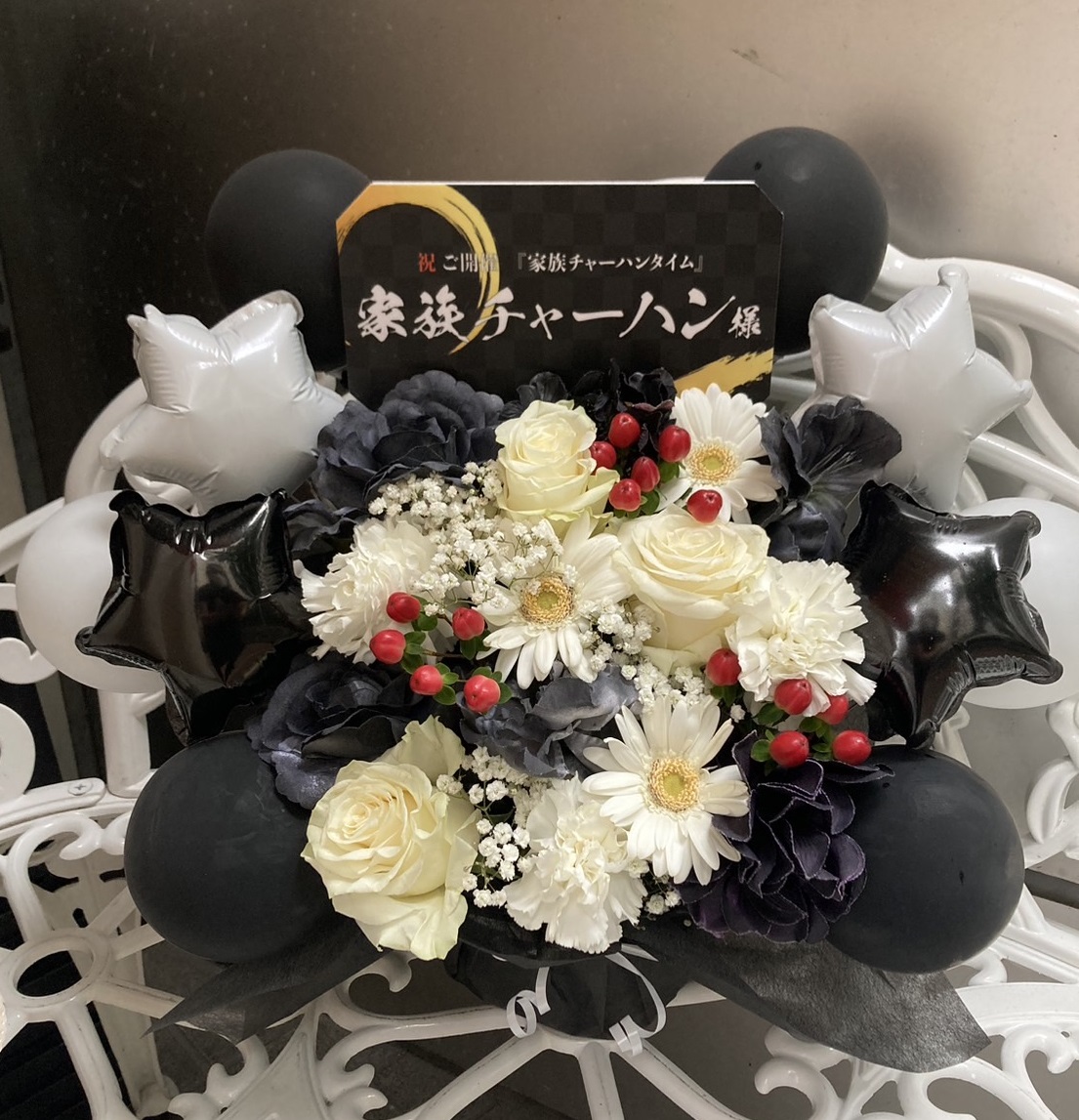 「家族チャーハンタイム」を祝うクールでスタイリッシュなフラスタ。黒と白を基調に赤が映えるシックなデザイン。