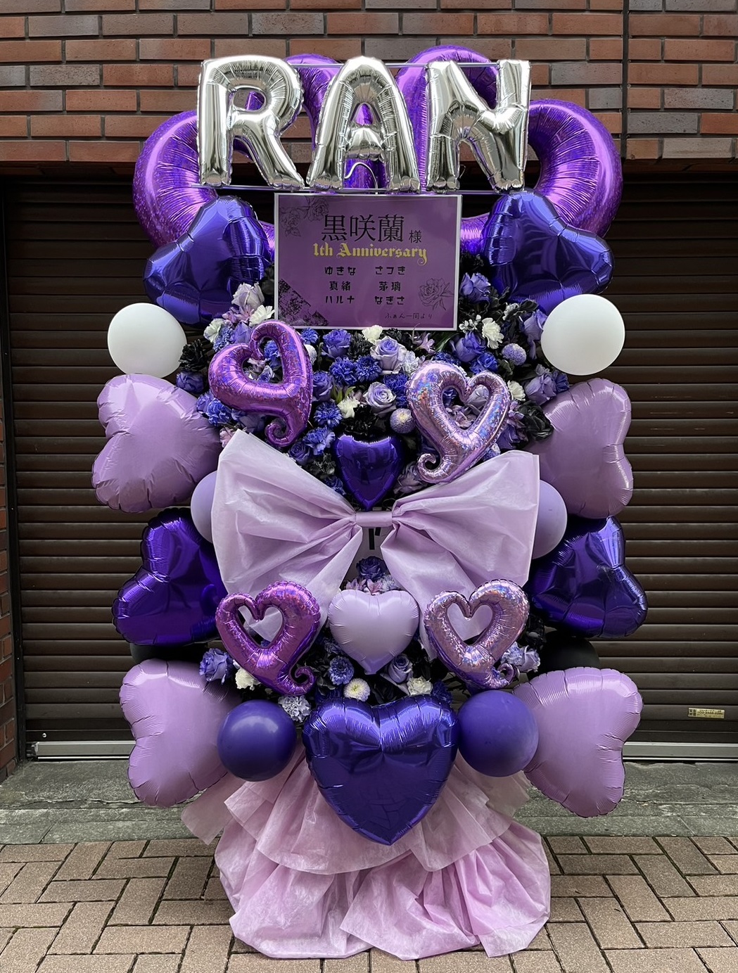 紫とパステルのグラデーションが美しい、華やかなバルーンと生花のフラスタ。黒咲蘭様の生誕祭と1周年記念を祝福します。