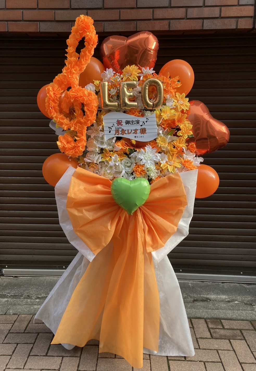 鮮やかなオレンジと黄色を基調に白でまとめた、音符とバルーンが華やかなフラスタ。アイドルのライブを彩る祝花です。
