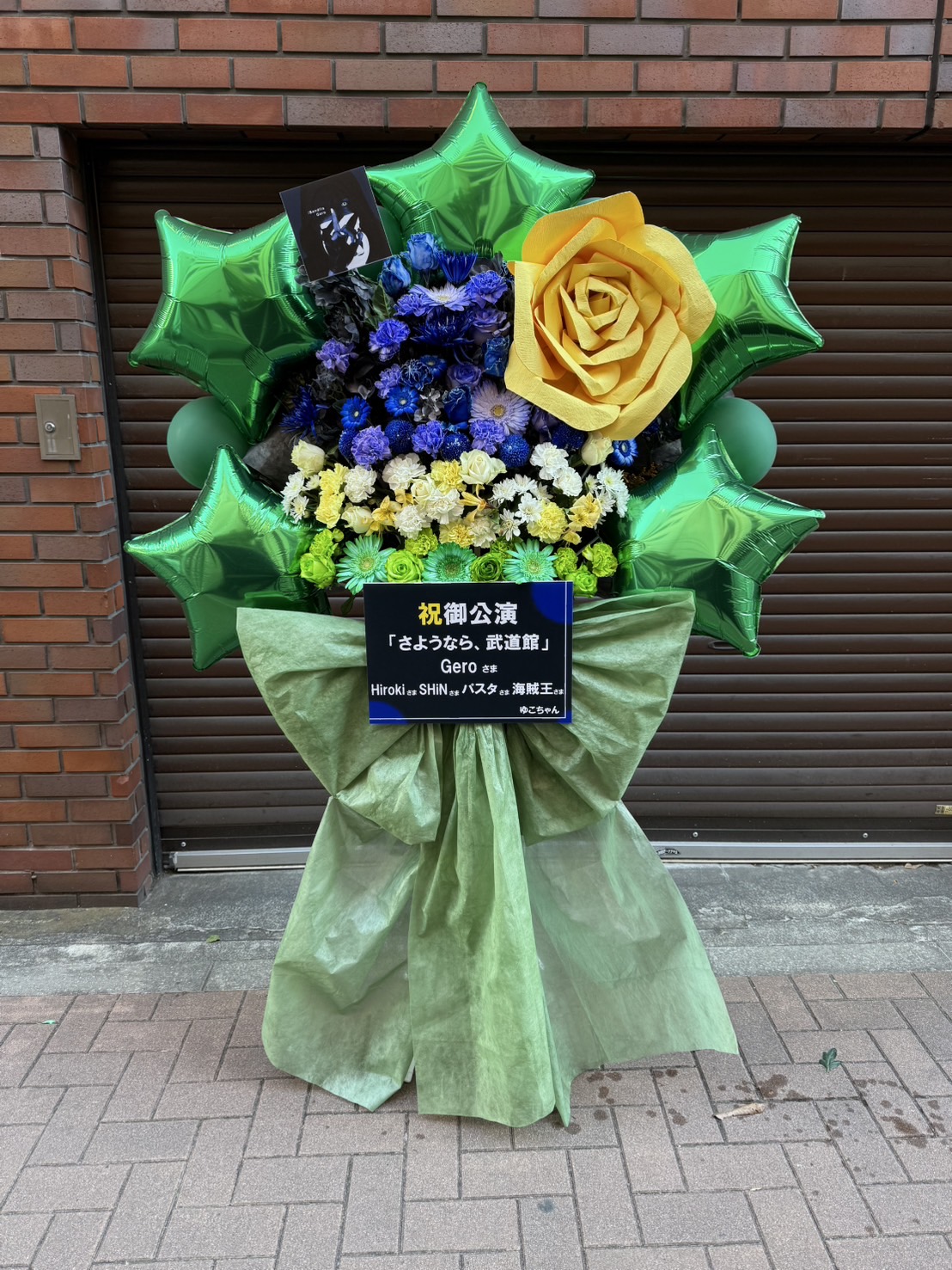 緑のバルーンとリボンが印象的な、青・黄・白の花々で彩られた華やかなフラスタ。Gero殿の武道館公演を祝う、鮮やかなデザインです。