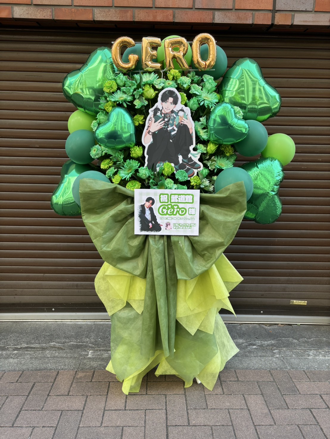 武道館ライブを祝う、緑と黄色が鮮やかなフラスタ。バルーンと生花、等身大パネルで華やかに飾られ、爽やかな雰囲気を演出しています。