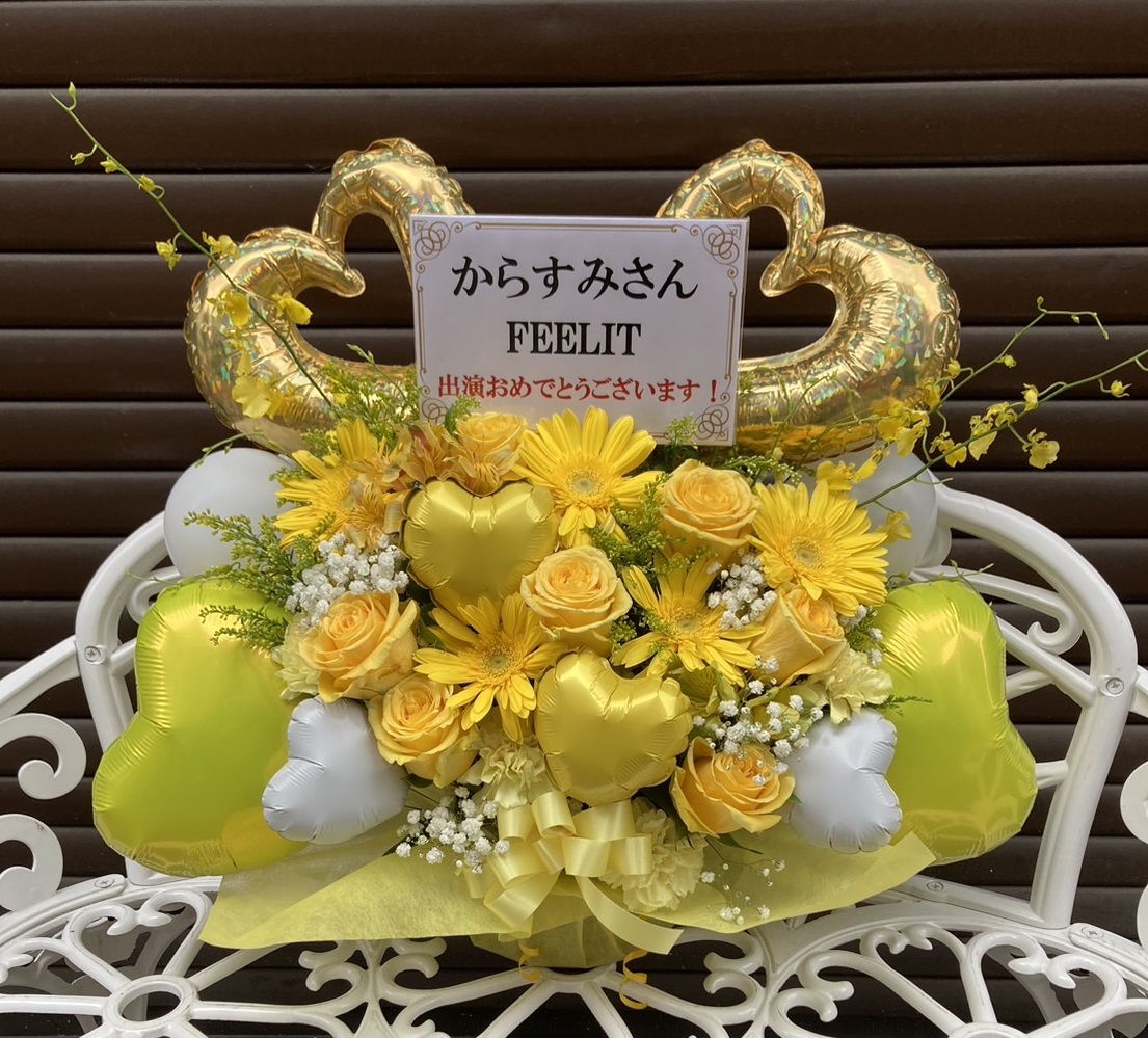 からすみさんへの出演祝いフラスタ。メインの黄色とゴールドが華やかで、ハートバルーンがキュートな印象。会場を明るく彩るスタンドです。