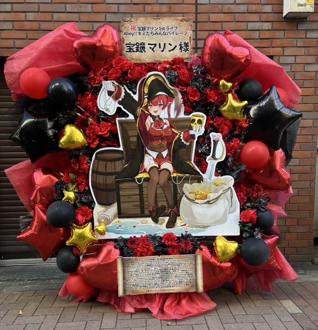 宝鐘マリン1stライブを祝う、赤と黒を基調とした海賊テーマのフラスタ。バルーンと花が豪華に彩ります。