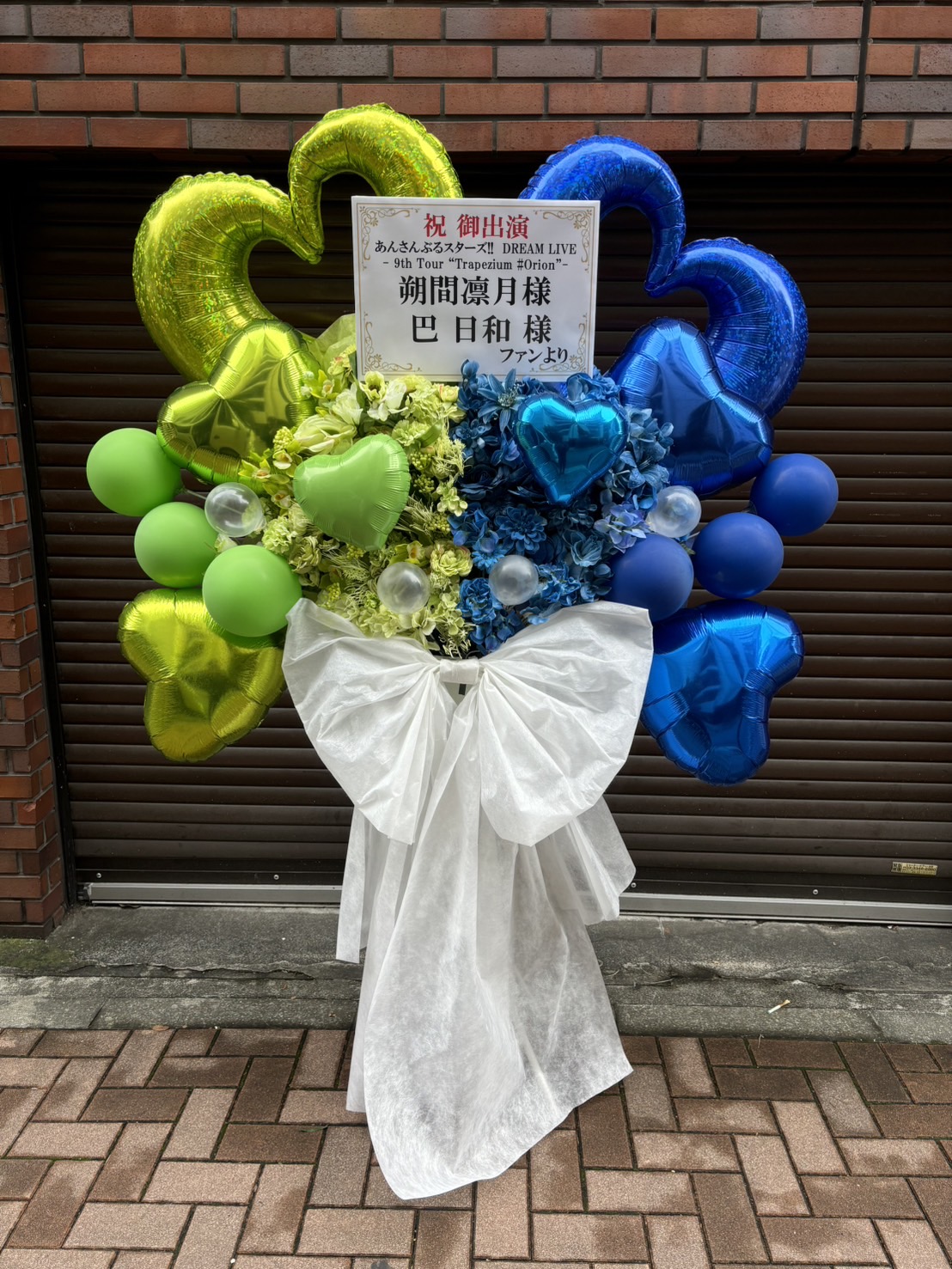 あんスタのライブへ、緑と青のバルーンと生花が華やかなフラスタ。爽やかで愛らしい雰囲気が目を引きます。