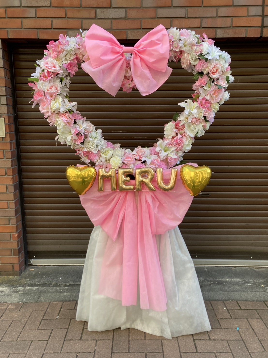 「める卒業イベント」へ贈られた、ピンクと白のお花が可愛いハート型のフラスタです。ゴールドのバルーンと大きなリボンが華やかな雰囲気を演出しています。